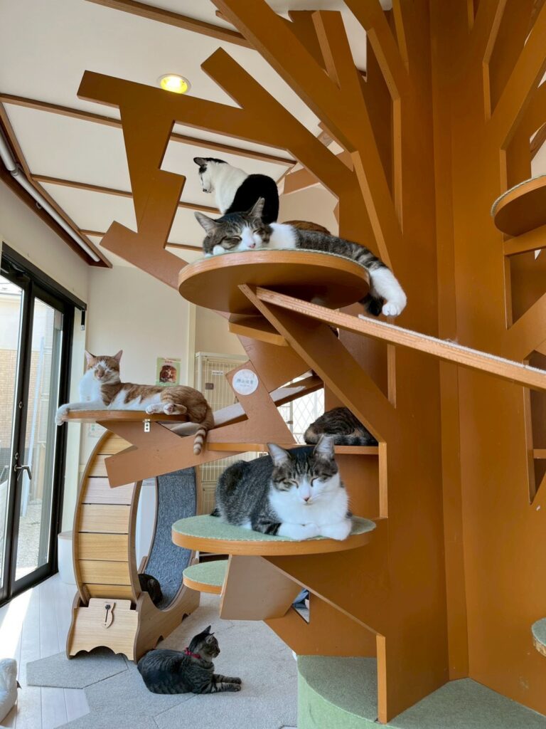 室内に入るとすぐに大きな木があり、先端に猫ちゃんがリラックスしていたのが目に入ってきてまるでねこの木の様に見えました🐱